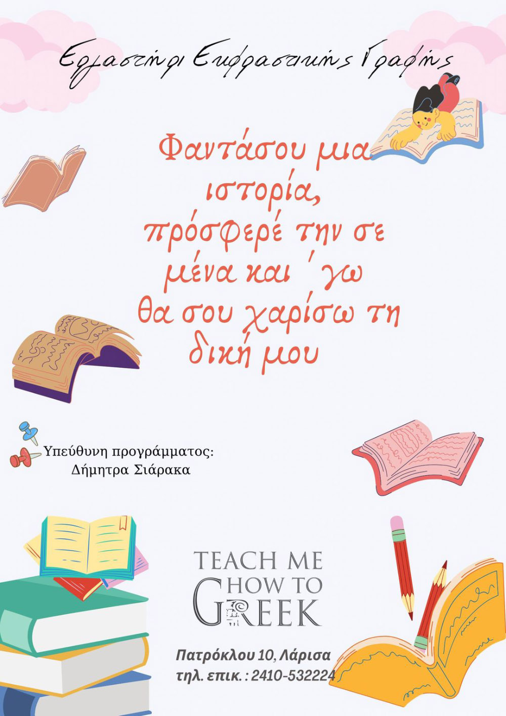 Φαντάσου μια ιστορία. Πρόσφερέ την σε εμένα και θα σου χαρίσω τη δική μου. Δώσε μου ένα ποίημα, ένα παραμύθι από αυτά που δεν τολμάς να πεις και από αυτά που θα ήθελες να πεις. Θα είμαστε γεμάτοι λέξεις, λέξεις που αντιλαμβανόμαστε διαφορετικά. Πάρε μια λέξη και δες την να ταξιδεύει, να χάνεται και να επιστρέφει. Θα είμαστε γεμάτοι μισοτελειωμένες ιστορίες, που ξεχάστηκαν σε συρτάρια. Θα έρθεις να μας πεις τη συνεχεία τους; Στο εργαστήρι αυτό μην φοβηθείς τα λάθη. Έλα να κάνεις λάθος τη λέξη και δώσε μου την ελευθερία της σκέψη σου. Στο εργαστήρι αυτό δεν θα μάθεις κάτι συγκεκριμένο. Θα έρθεις ένα καλοκαιρινό ζεστό απόγευμα να μιλήσουμε, να επικοινωνήσουμε τις λέξεις αυτές σε ένα λευκό χαρτί. Αγαπάς, αγχώνεσαι, δουλεύεις, ερωτεύεσαι, θυμώνεις, αλλάζεις . Τα συναισθήματα σου είναι η αρχή και αν υπάρχει συνέχεια ή τέλος θέλουμε να το μοιραστείς, αν το θες και εσύ. Έλα να γράψουμε μαζί!